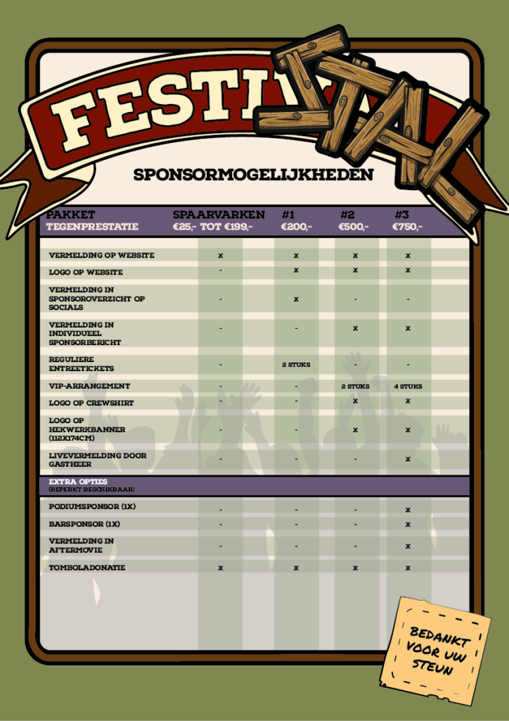 Bij een donatie tussen €25,- en €199,- wordt u automatisch een jaar lang lid van het Bieske Spaarvarken. Als dank vermelden wij uw naam op onze website festistal.nl onder ‘Mede mogelijk gemaakt door’. Ook wordt u automatisch lid van onze fanclub en profiteert u van 10% korting op al onze merch gedurende 2026.
